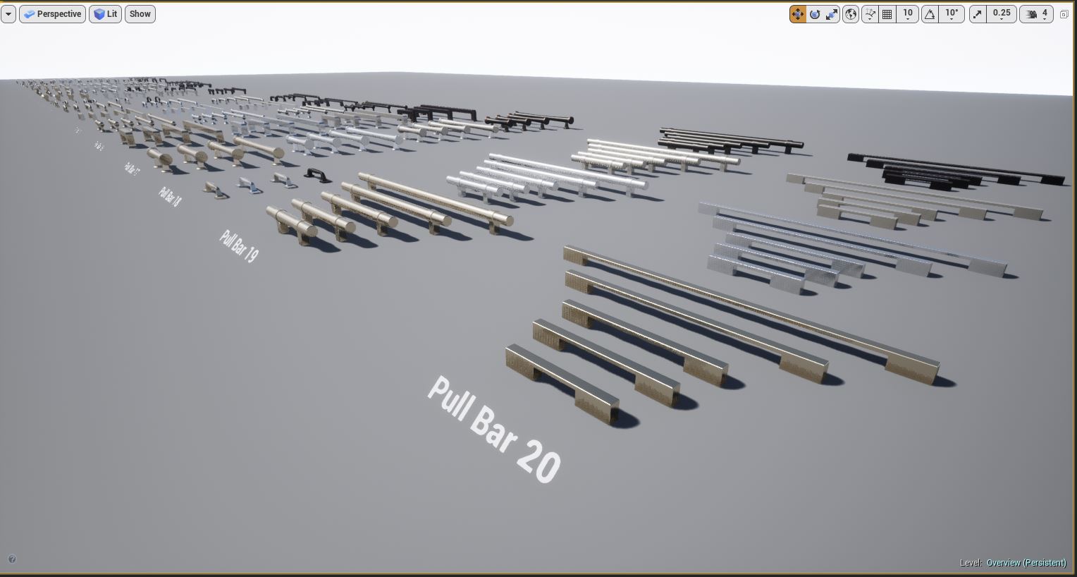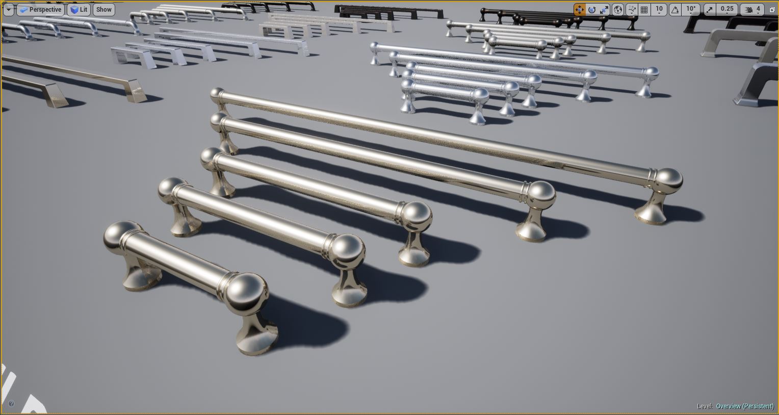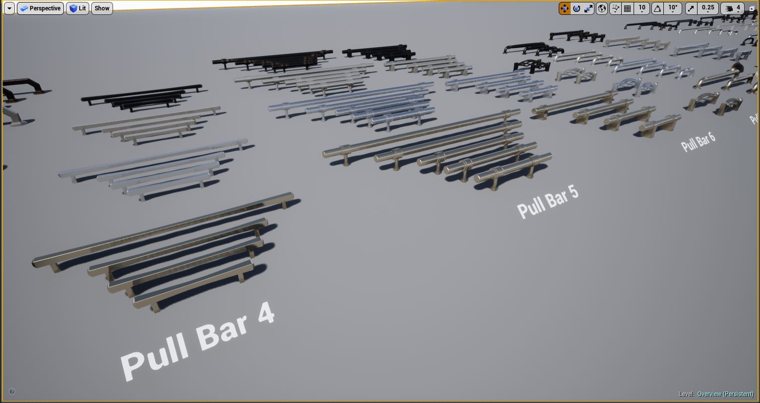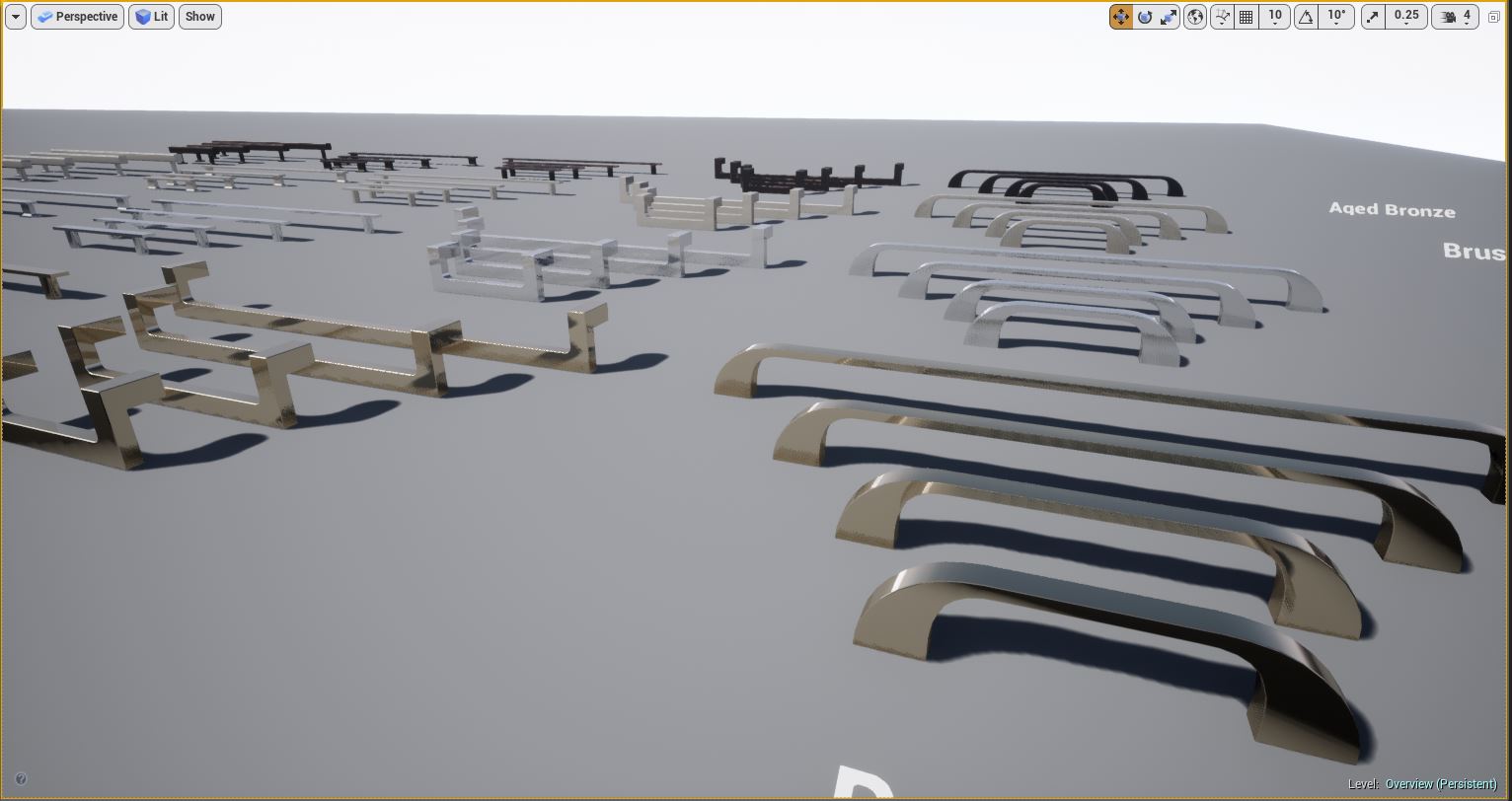Kitchen and Bath Handles for Arch Vis contains multiple configurations of real world cabinet and drawer pull handles for use in Architectural Visualization inside Unreal Engine. Each mesh was modeled and custom UV'd specifically for Unreal Engine PBR for realistic lighting and rendering. Edge Damage and Dirt Masks are included for each handle for aging effects, allowing you to edit these, including changing the color and material of any handle through an instanced material.