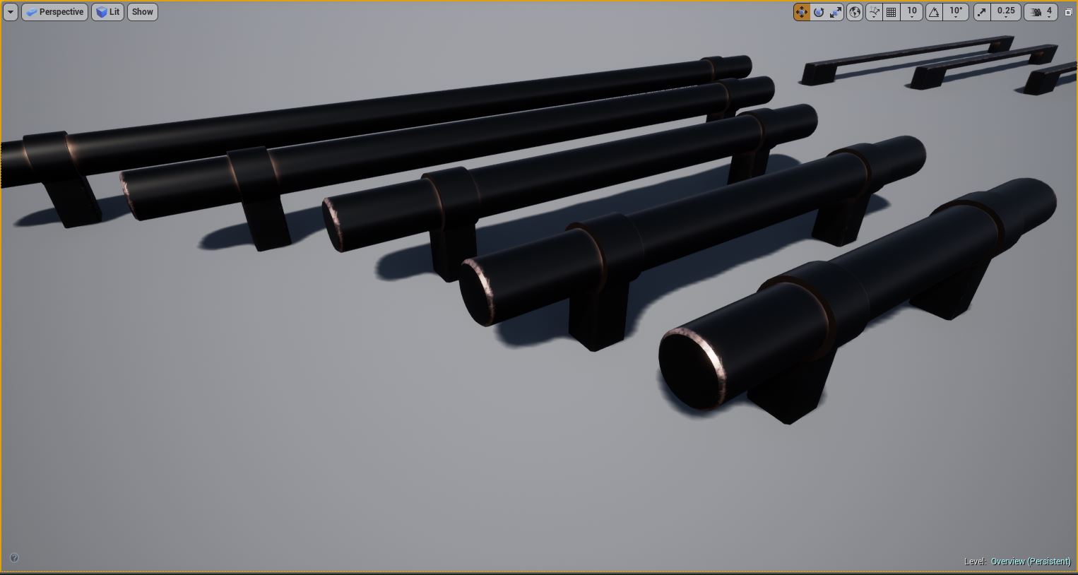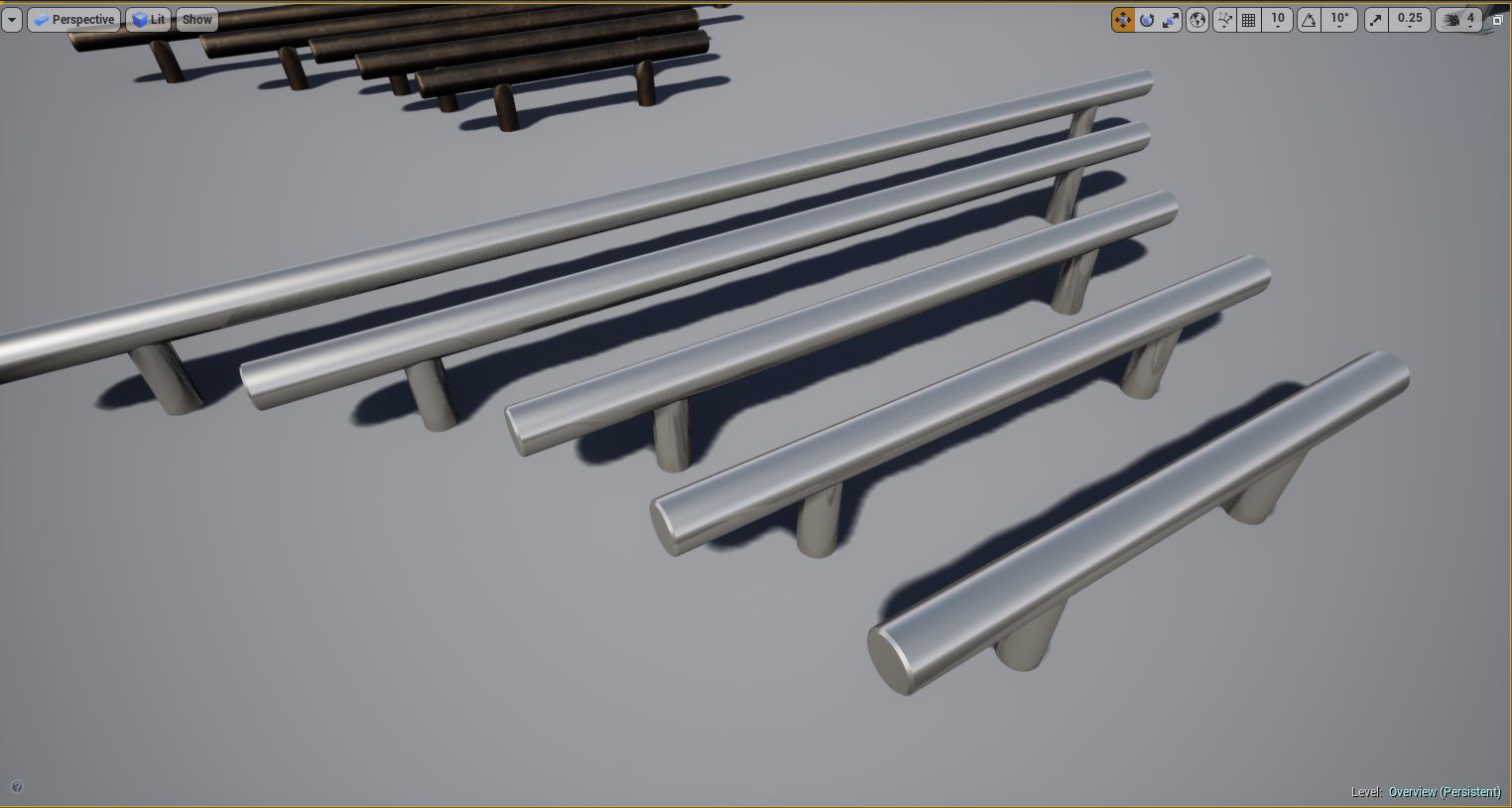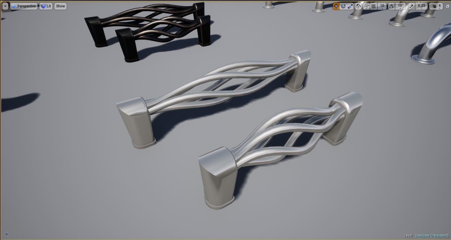 Kitchen and Bath Handles for Arch Vis contains multiple configurations of real world cabinet and drawer pull handles for use in Architectural Visualization inside Unreal Engine. Each mesh was modeled and custom UV'd specifically for Unreal Engine PBR for realistic lighting and rendering. Edge Damage and Dirt Masks are included for each handle for aging effects, allowing you to edit these, including changing the color and material of any handle through an instanced material.