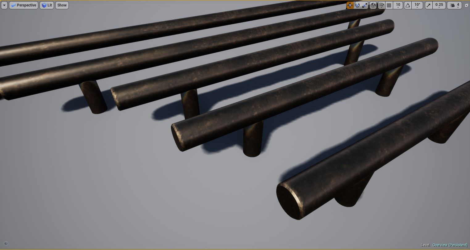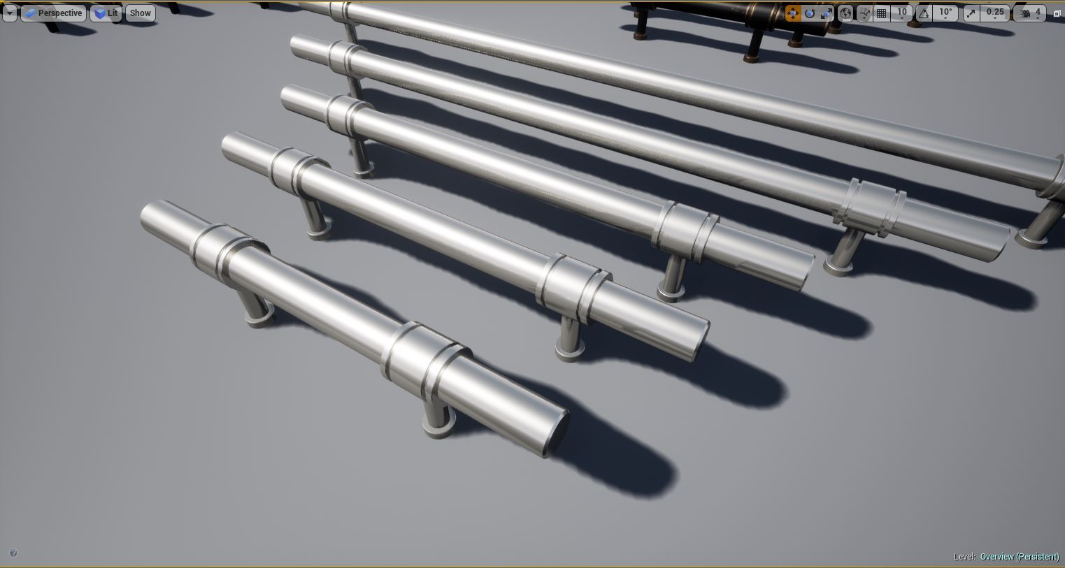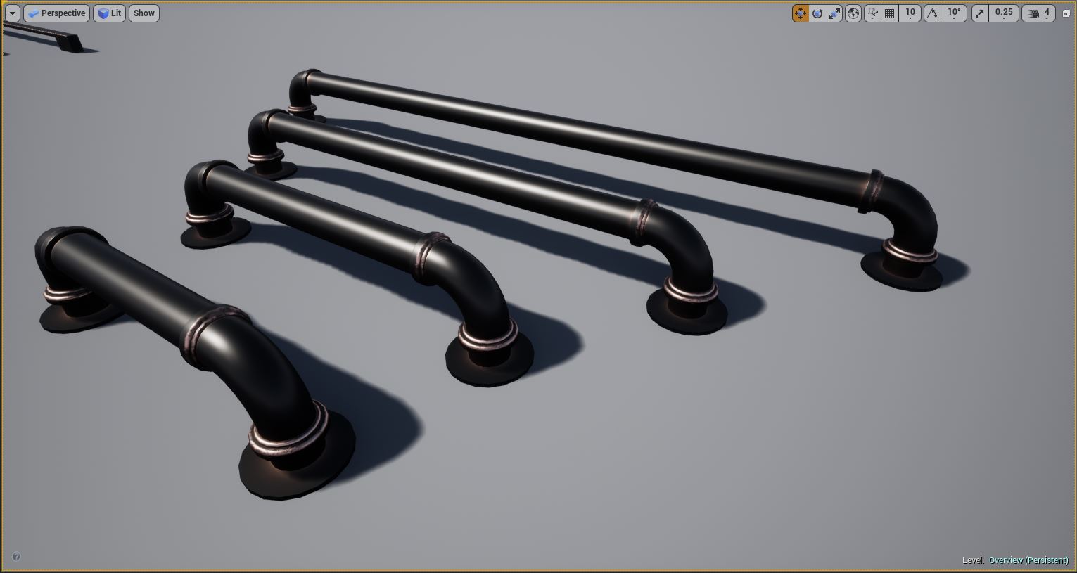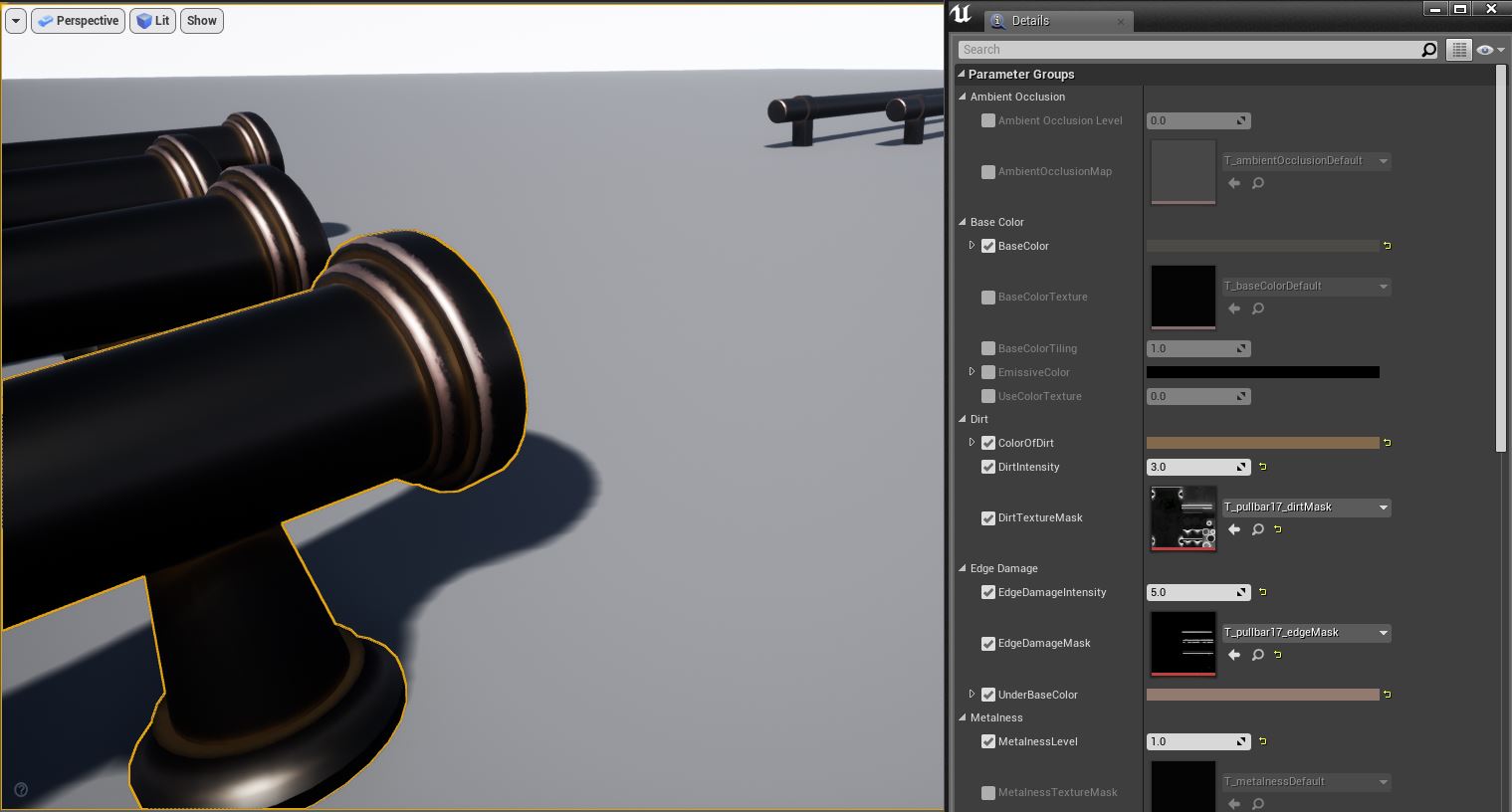 Kitchen and Bath Handles for Arch Vis contains multiple configurations of real world cabinet and drawer pull handles for use in Architectural Visualization inside Unreal Engine. Each mesh was modeled and custom UV'd specifically for Unreal Engine PBR for realistic lighting and rendering. Edge Damage and Dirt Masks are included for each handle for aging effects, allowing you to edit these, including changing the color and material of any handle through an instanced material.